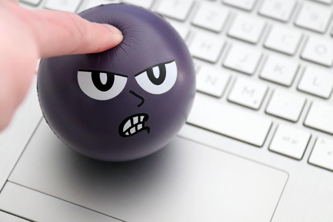 laptop a na nim piłeczka antystresowa ze złą miną